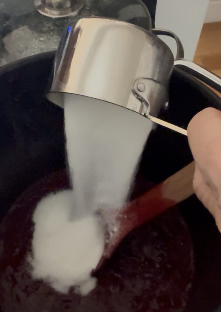 Add all 5 cups of sugar at once and stir well. Bring the mixture back to a rolling boil and boil hard for exactly one minute.