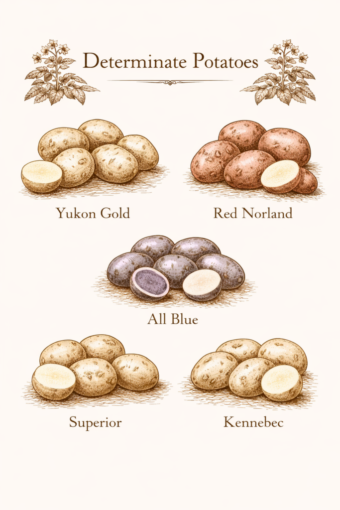 Determinate varieties are the straightforward ones. They grow to a certain size, they set their tubers at a defined depth along the stolons (those little underground root-like structures that actually become your potatoes), and then they’re done. The plant puts all its energy into ripening what it’s already made.