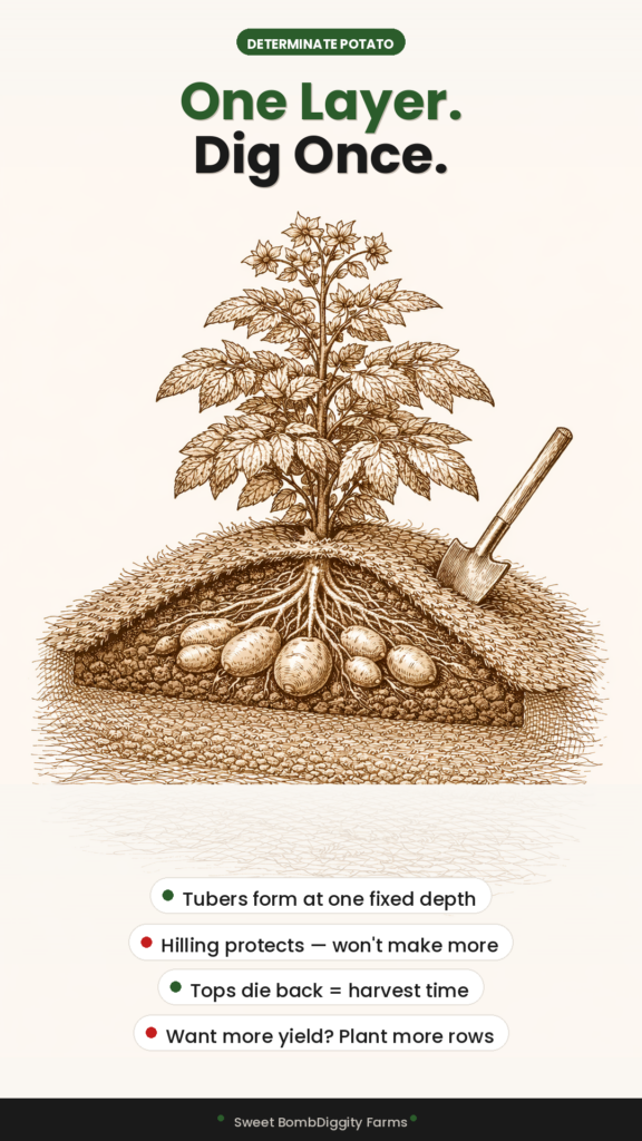 - Determinate potatoes form their tubers at a fixed point along the stem. Hill them a little if you’d like — it’ll protect the potatoes from light — but it’s not going to make more potatoes appear. What you planted is what you’ll get. One layer. Dig once.