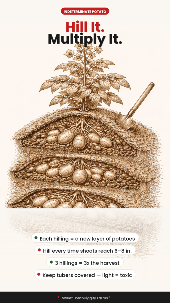 Picture it this way: you plant your seed potato. The plant grows up. You hill. The buried stem sets a layer of potatoes at that depth. The plant keeps growing up. You hill again. Another layer forms below the new soil surface. You hill one more time. Another layer. By the end of the season, you might be digging through three distinct layers of potatoes from a single plant. That’s the magic of an indeterminate variety and why so many serious growers love them.