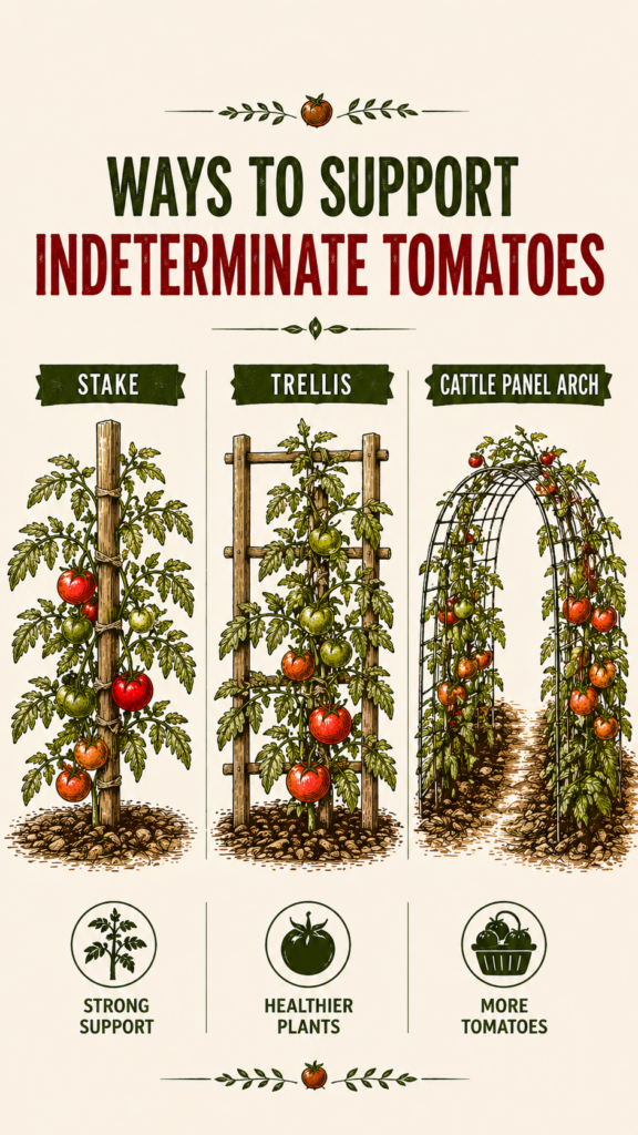 A sturdy tomato cage (the kind with 3 or 4 rings) works well for most determinate varieties. You can also use a short stake — about 3 to 4 feet — and loosely tie the main stem as it grows. You won’t need to do much pruning, and you won’t need to train them to climb.