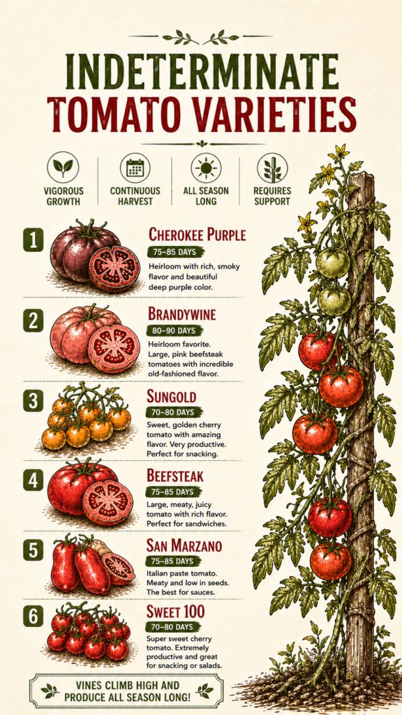 Indeterminate tomatoes are true vines. They don’t stop growing — ever — until frost kills them. In ideal conditions, a single indeterminate plant can reach 6, 8, even 10 feet tall. They produce flowers and fruit continuously all season, which means you’re picking tomatoes from June through October rather than all at once.